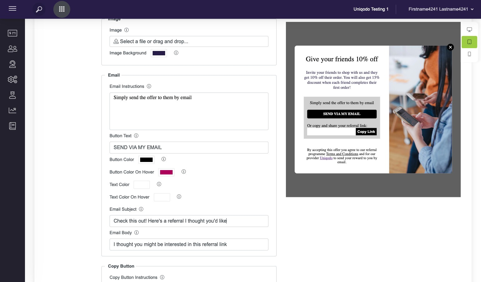 Here you will be able to use the editor to customise the overlay that will be shown to the referrer to allow them to share or copy their unique referral link
