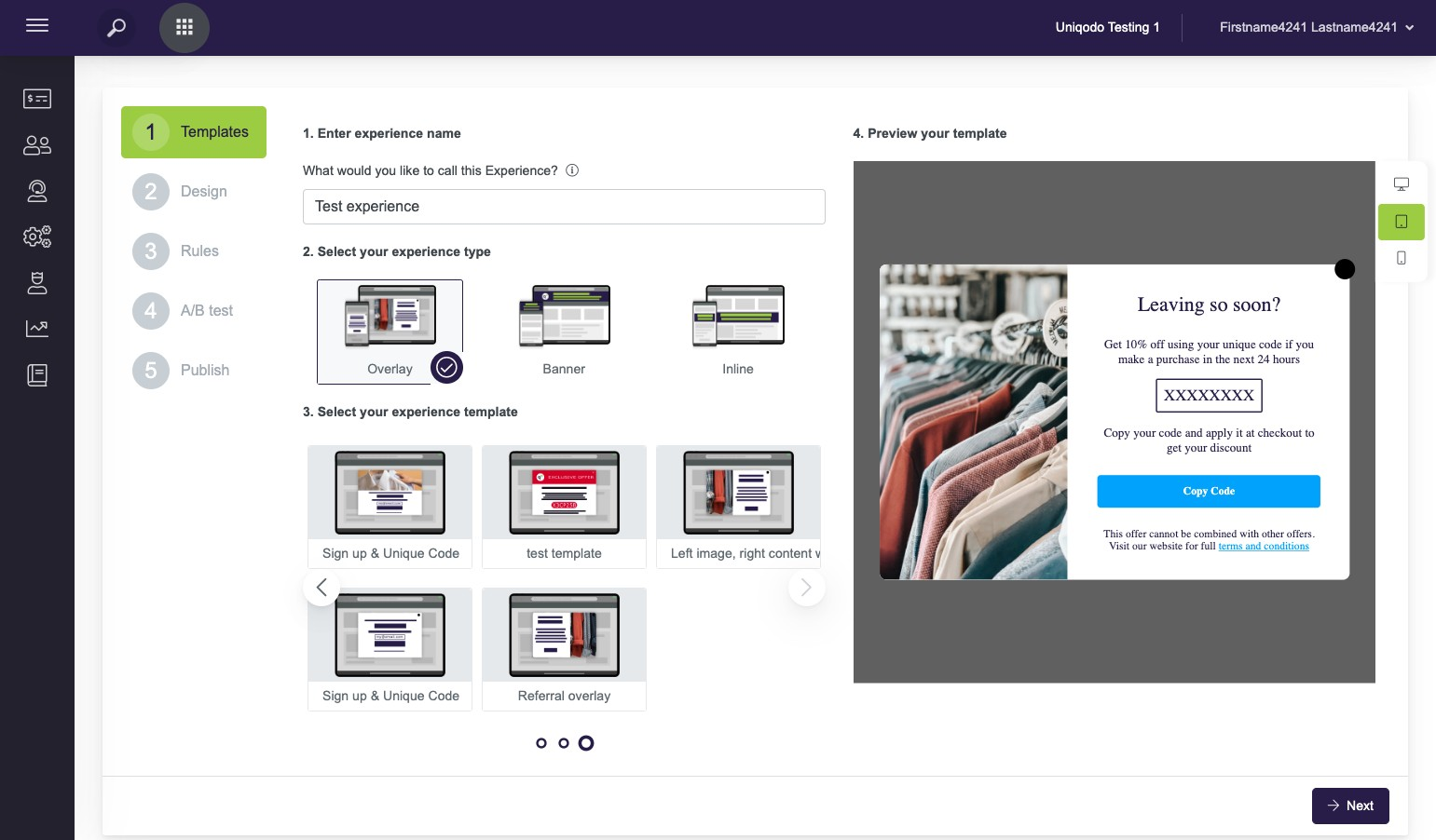 Select the overlay experience type and use the carousel to navigate to the overlay called "Referral Overlay"