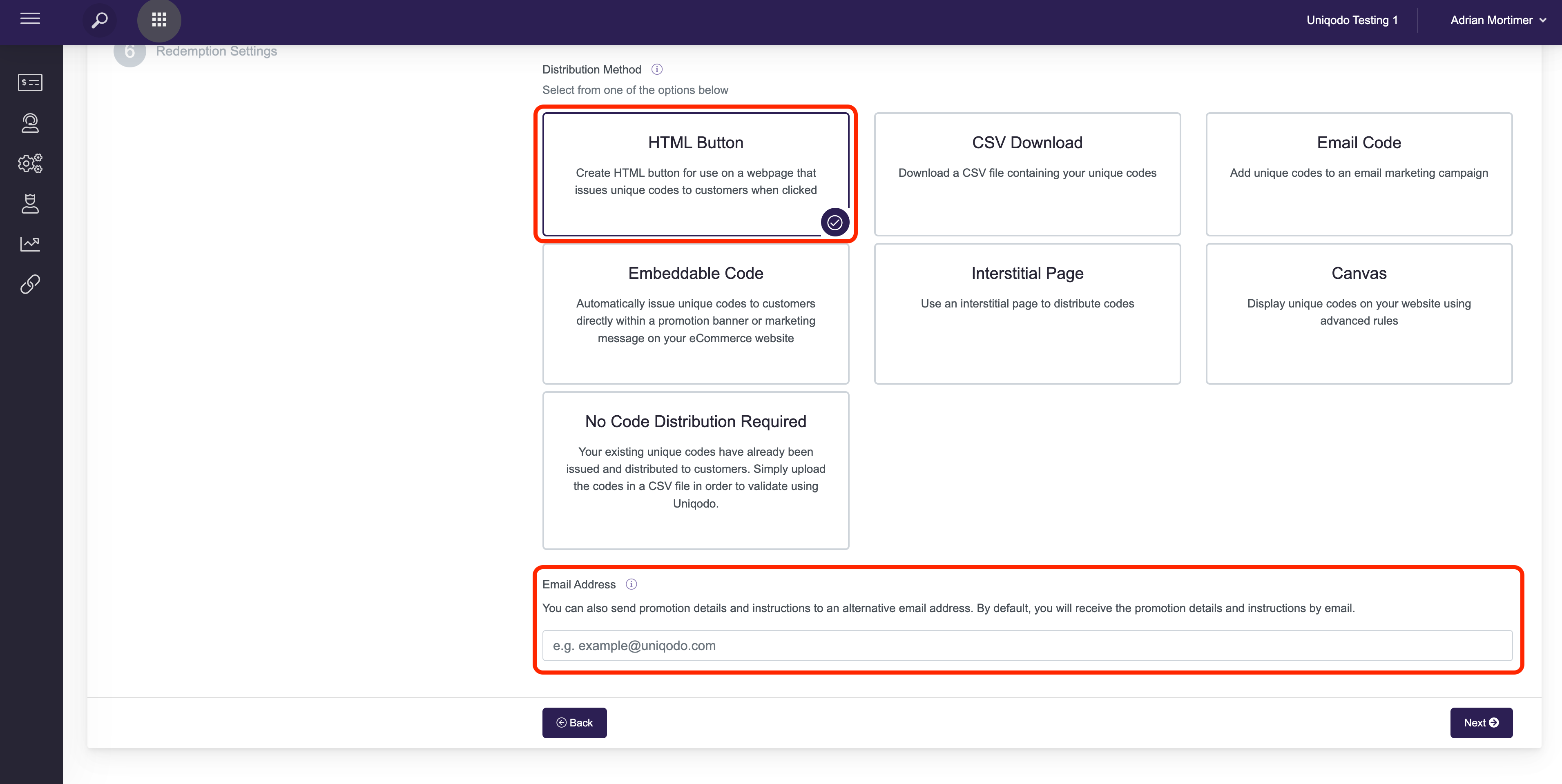 Step 2 - Select the HTML Button distribution method and populate the bottom field with an email address to receive instructions on how to set up the HTML button feature, having completed the promotion setup for this offer. As the promotion creator, you should automatically be sent the button HTML without inputting your own email address here.
